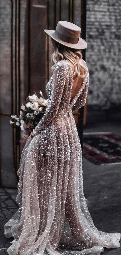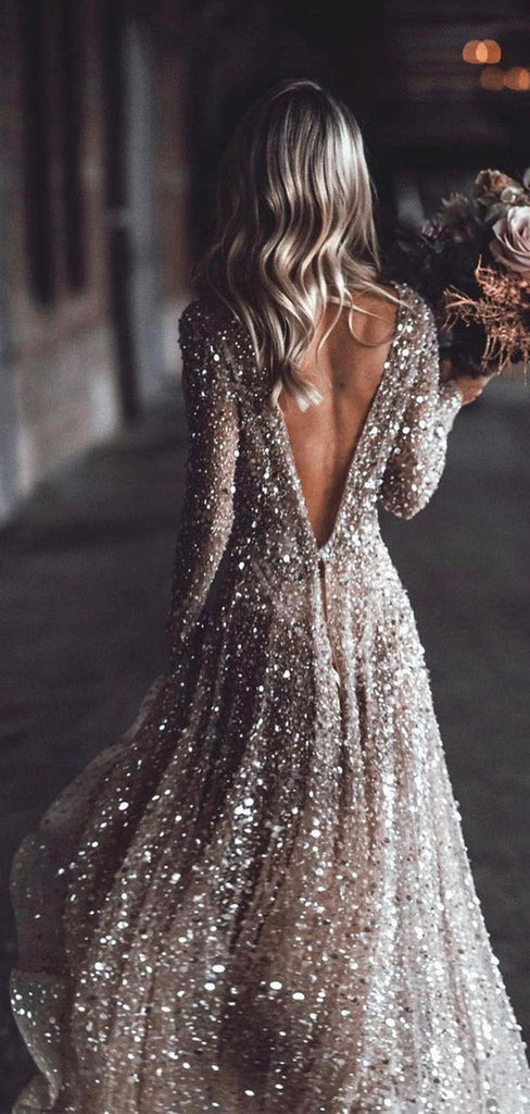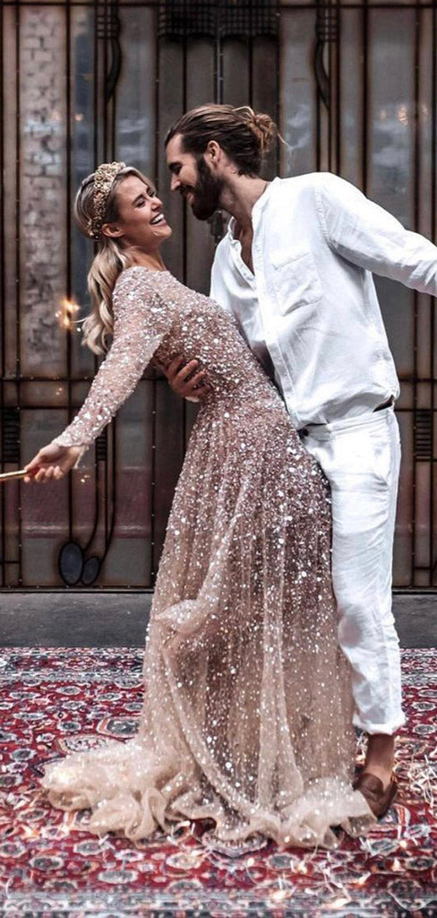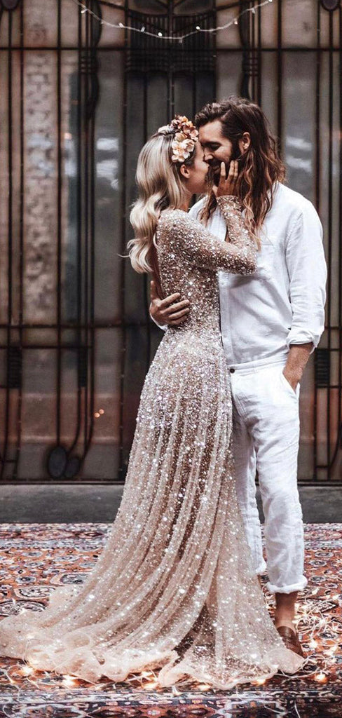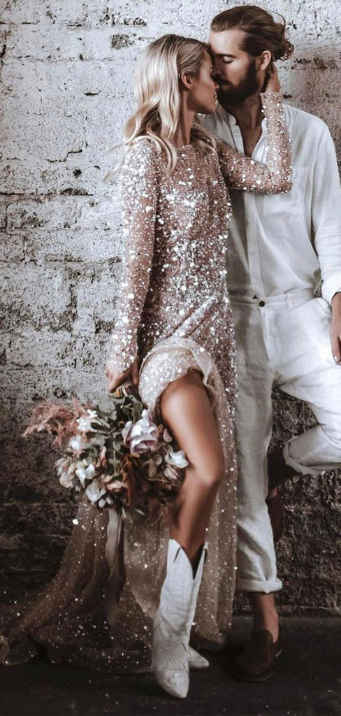 Sparkly Sequin Long Sleeves Unique Dream Beach Vintage Long Wedding Dresses WD003